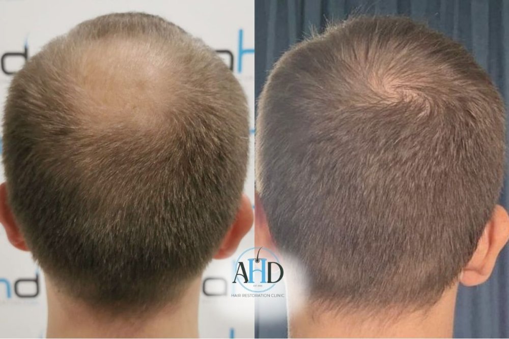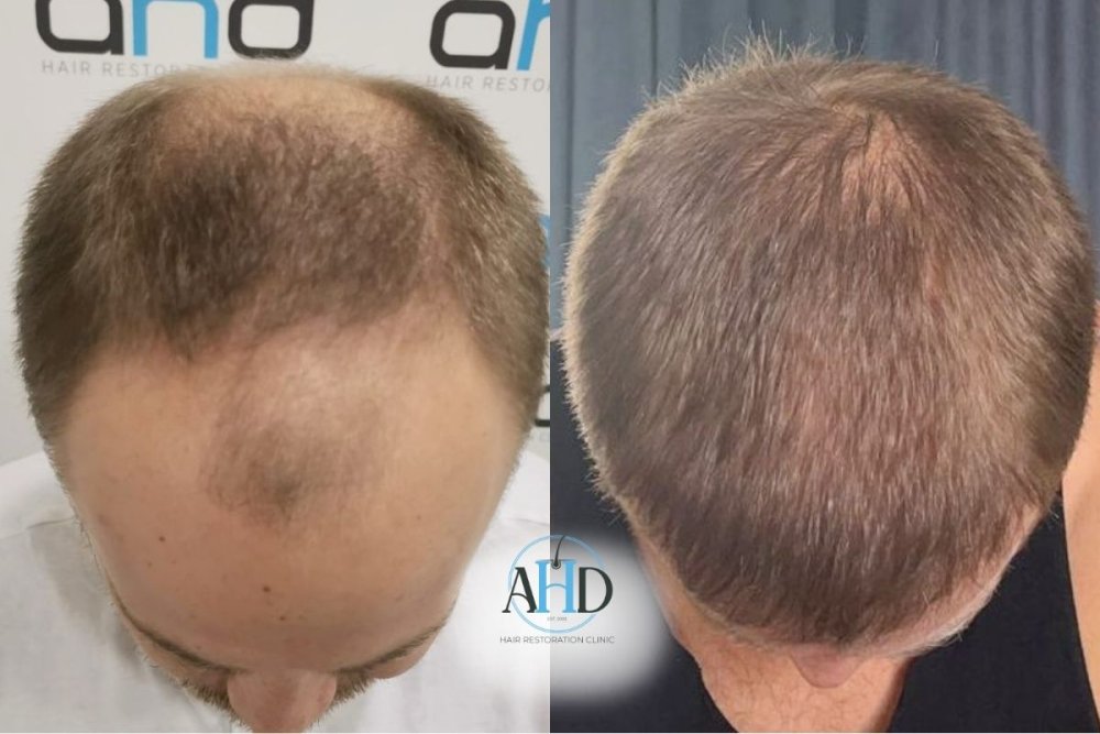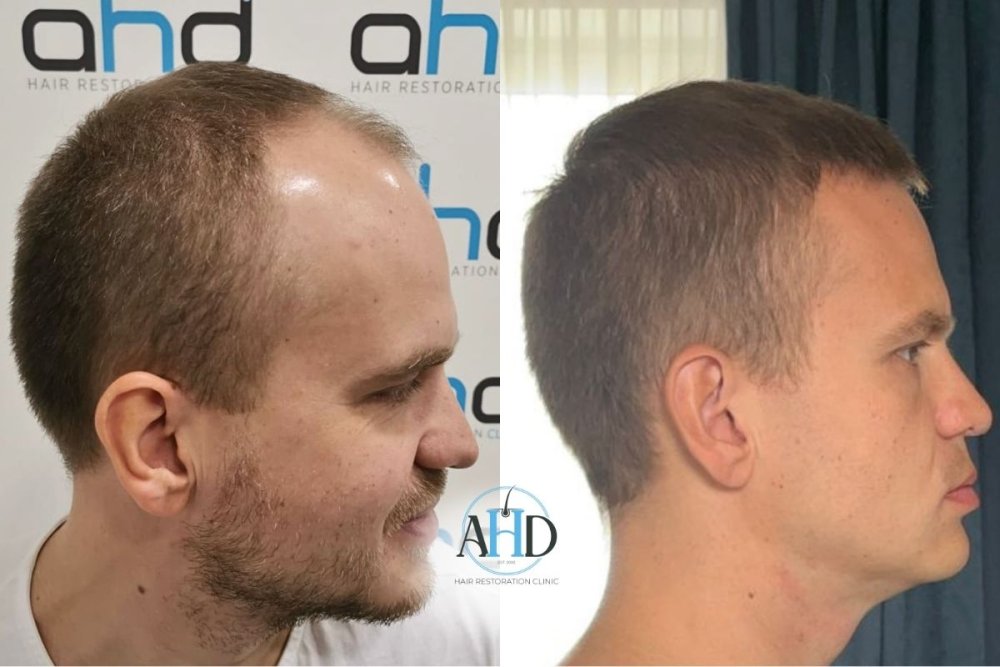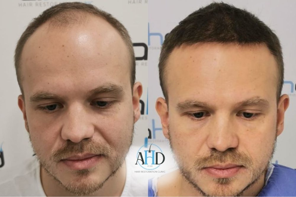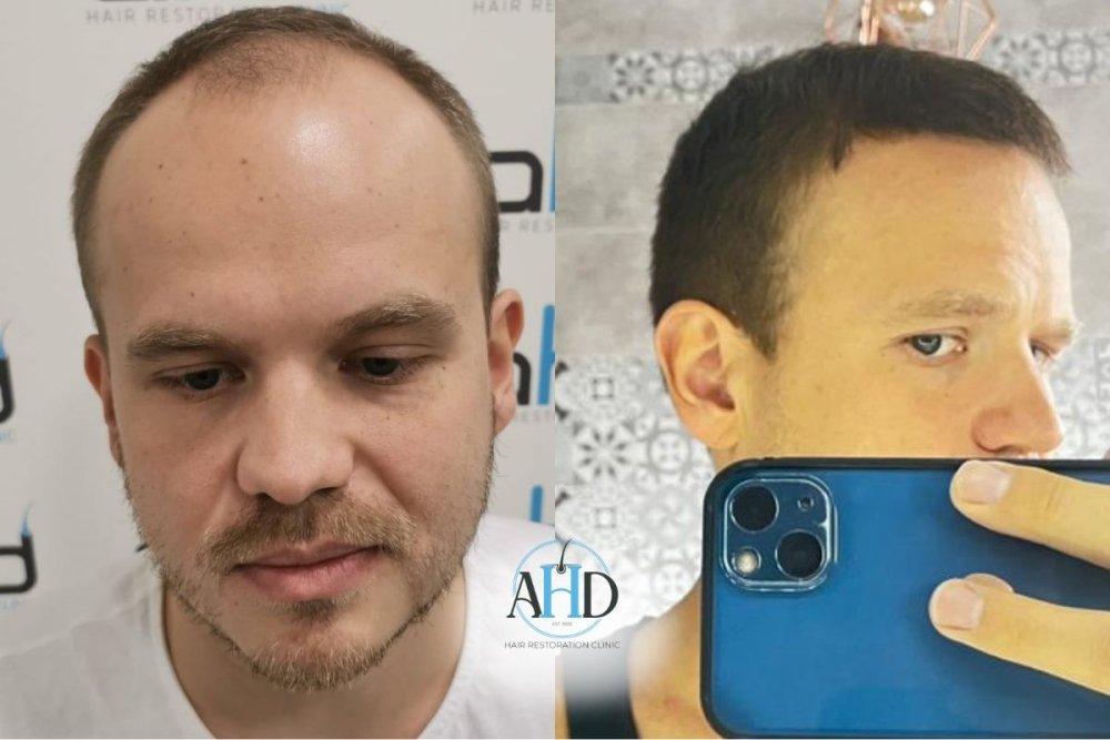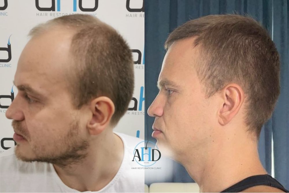 A 37-year-old male patient received two hair transplant surgeries via the DHI method, scheduled at a one-year interval. The initial session targeted vertex restoration, followed by a second procedure dedicated to the frontal hairline. A natural hairline was carefully crafted, with grafts strategically implanted to maximize density and conceal thinning regions.**