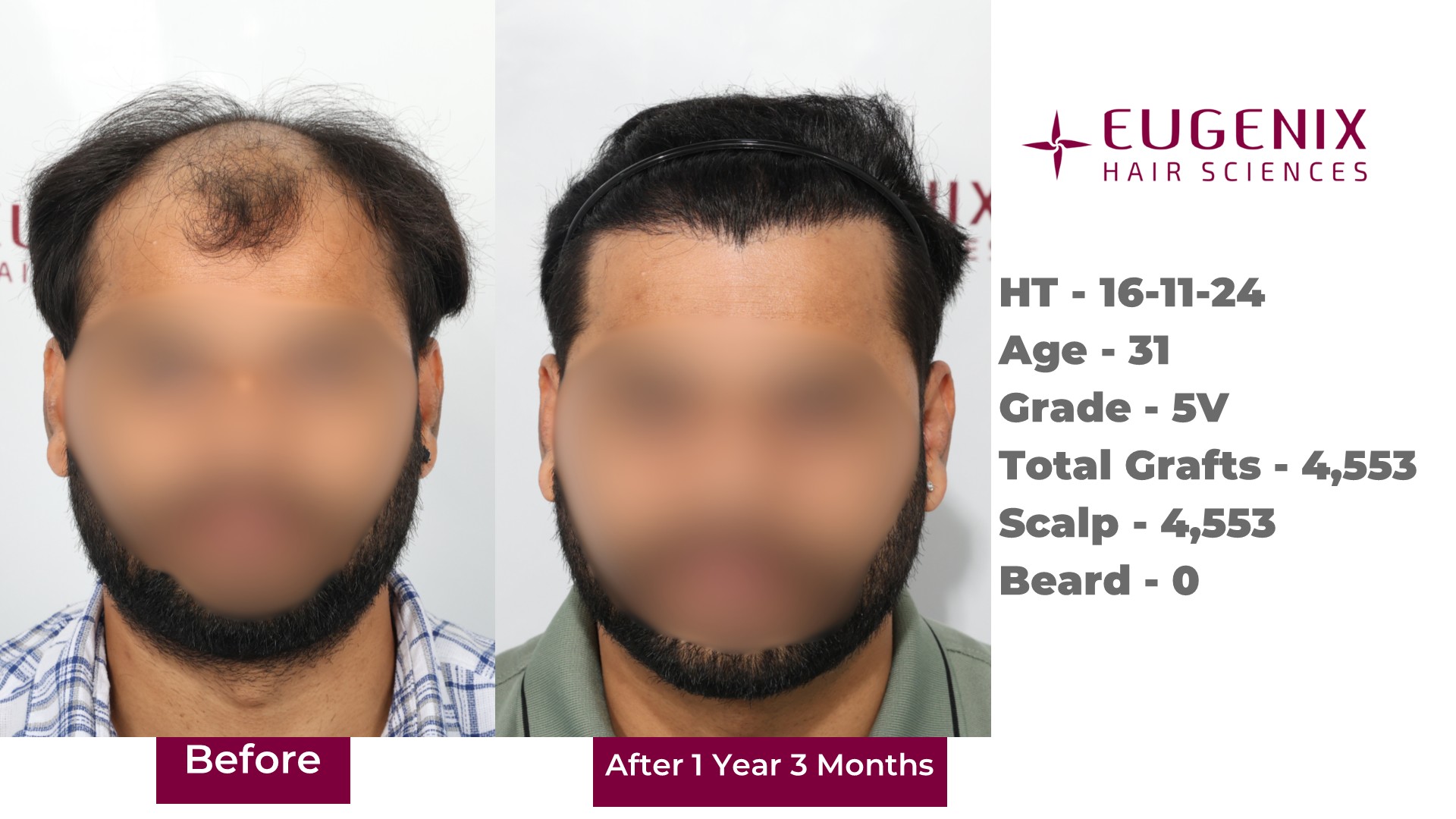 The procedure took place in November 2024 for the front scalp, during the procedures we implanted 4,553 grafts using DHT to restore the patient’s front, mid scalp and crown.