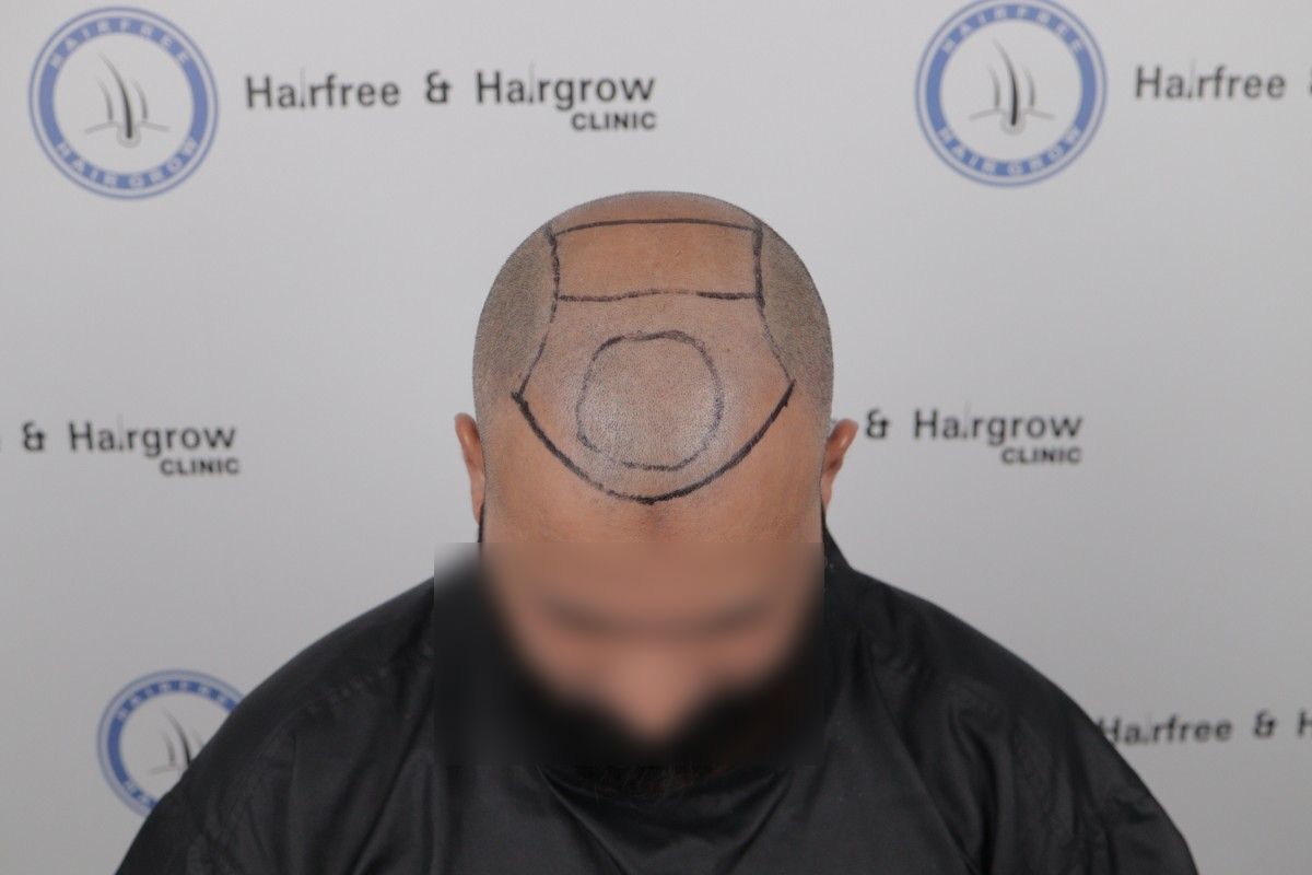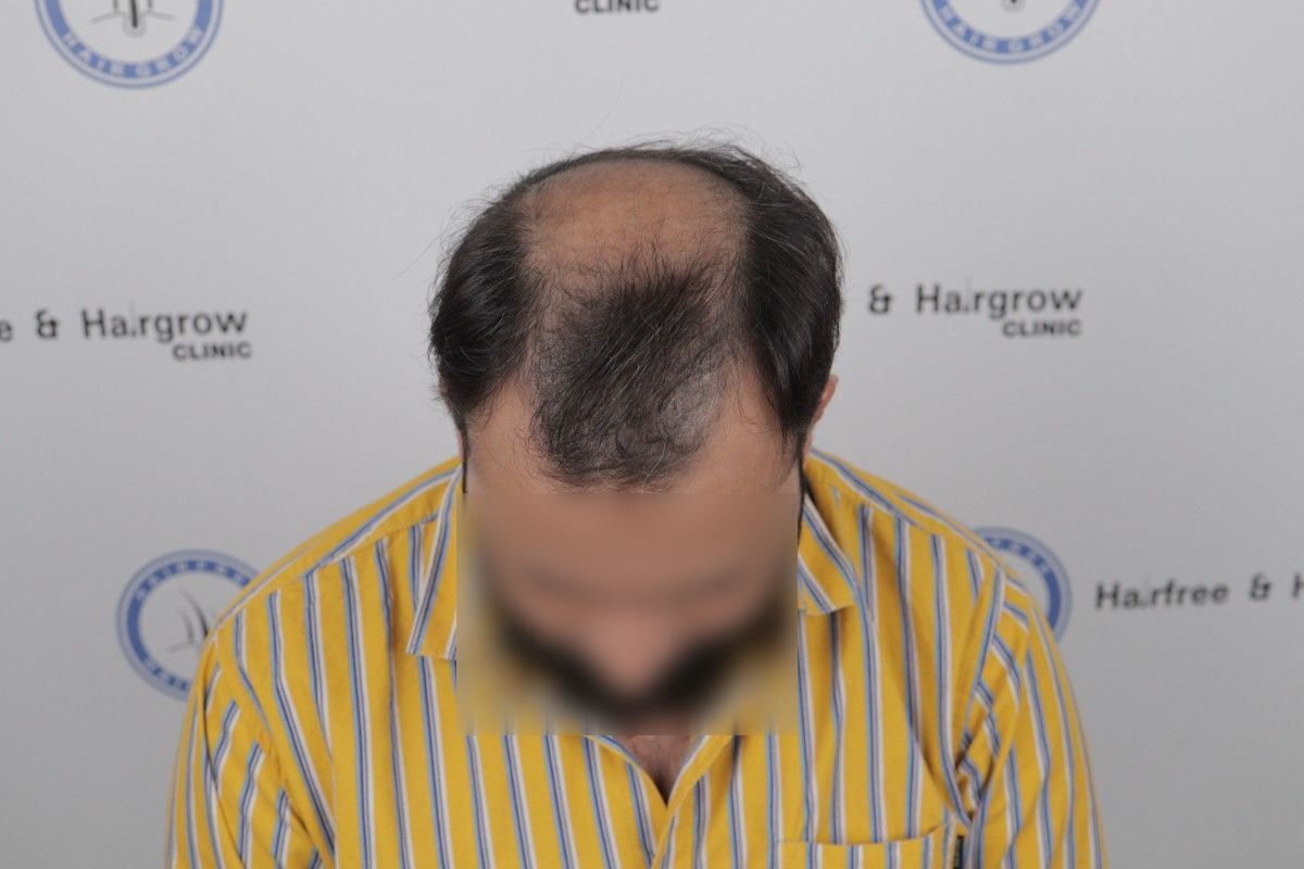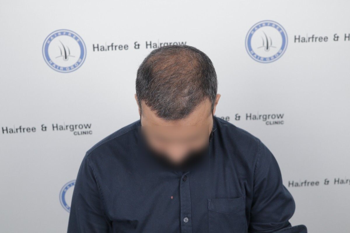 The patient was clinically diagnosed with androgenetic alopecia (male pattern hair loss), classified as Norwood Grade IV-A, following scalp examination and trichoscopic evaluation.