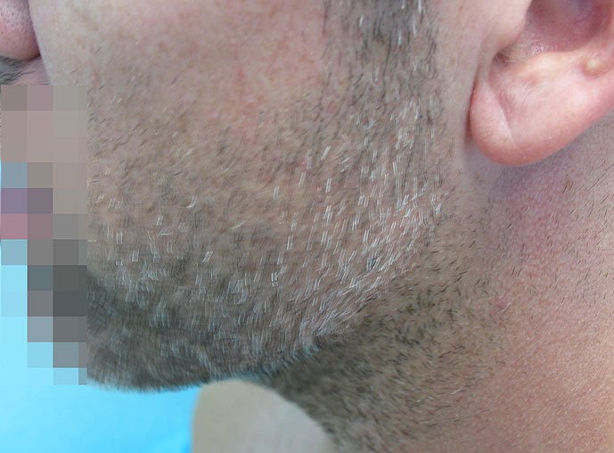 The result at 1 year after the last surgery is a fuller look with still a pristine back and sides of the head which is not overharvested and devoid of a strip scar that could have limited his hair styling options significantly. With this procedure, the patient is able to sport a crew cut without the fear of exposing a linear scar, yet he still is left with an ample supply of head and body donor hair for any touch ups or to address future progression of baldness.